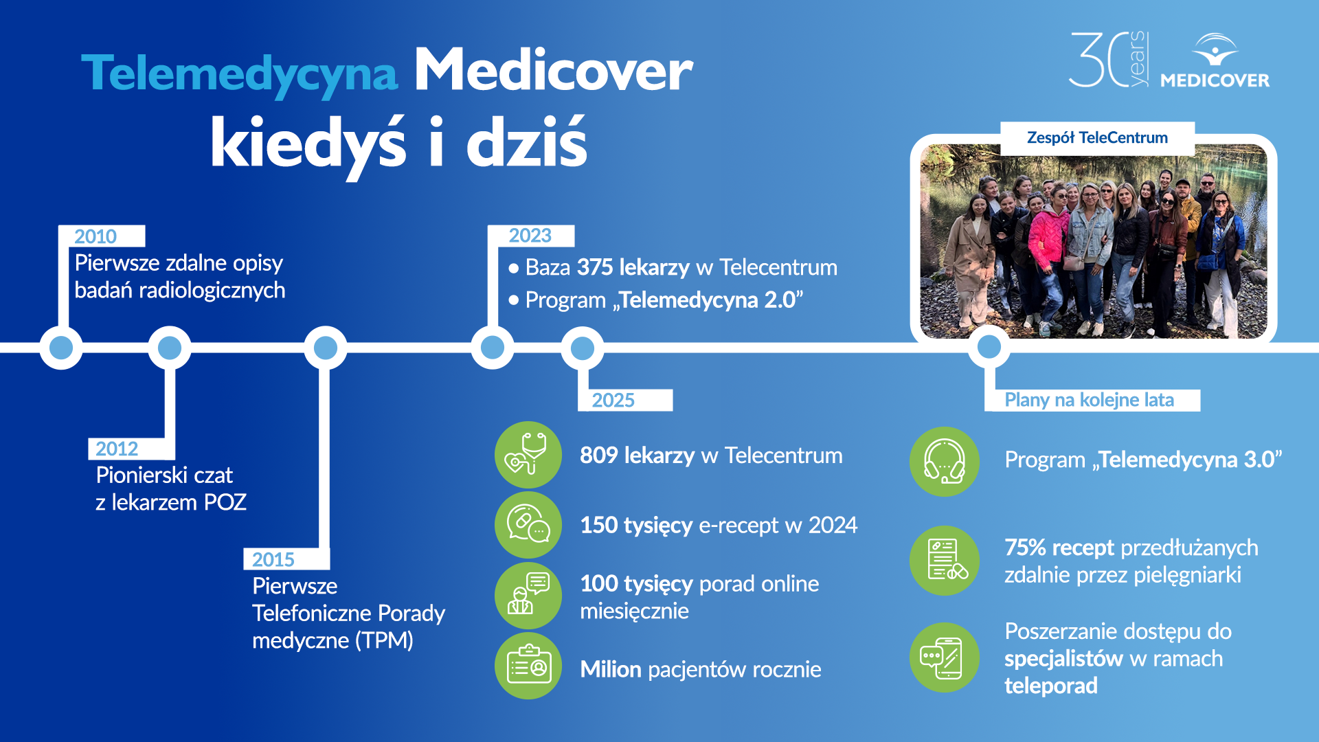 Medicover od blisko 15 lat redefiniuje kształt modelu opieki nad pacjentem z uwzględnieniem e-rozwiązań. Od pionierskich kroków, takich jak zdalne opisy badań i czat z lekarzem POZ, po dzisiejszą kompleksową opiekę na odległość z udziałem blisko 1000 lekarzy, konsekwentnie wyznaczamy trendy i podnosimy standardy naszych usług. Rekordowe liczby zapytań i udzielonych porad, a także stale wdrażane innowacje, potwierdzają, że obrana strategia przynosi naszym pacjentom wymierne korzyści. Nieustannie inwestujemy więc w rozwój, czego dowodem jest koncepcja Telemedycyny 3.0 i plany dalszej migracji teleporad specjalistów. Naszym celem jest zwiększanie dostępności, optymalizacja procesów i zapewnienie pacjentom jak najwyższej jakości usług, w oparciu o innowacyjne technologie. Te działania są także wyrazem dbałości o naszych pracowników. Dzięki rozwojowi telemedycyny optymalizujemy ich pracę, która na co dzień bywa bardzo wymagająca, umożliwiając im skupienie uwagi na najważniejszych aspektach opieki